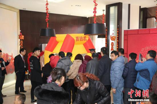 資料圖:2016年2月27日,山東東營(yíng),看房的市民在商家設(shè)置的“搶錢機(jī)”內(nèi)搶著飛舞的人民幣,搶到的人民幣歸市民所有。圖片來(lái)源:視覺(jué)中國(guó)