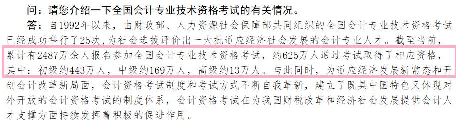 從10月25日財(cái)政部官網(wǎng)公布的《2018年度全國(guó)會(huì)計(jì)專業(yè)技術(shù)初級(jí)資格考試有關(guān)問題答記者問》悉知,截至當(dāng)前,累計(jì)有2487萬(wàn)余人報(bào)名參加全國(guó)會(huì)計(jì)專業(yè)技術(shù)資格考試,約625萬(wàn)人通過考試取得了相應(yīng)資格,其中:初級(jí)約443萬(wàn)人,中級(jí)約169萬(wàn)人,高級(jí)約13萬(wàn)人。