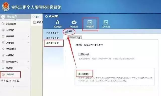 (2)進(jìn)入“系統(tǒng)設(shè)置”—“申報模式設(shè)置”,選擇“介質(zhì)申報”后保存。